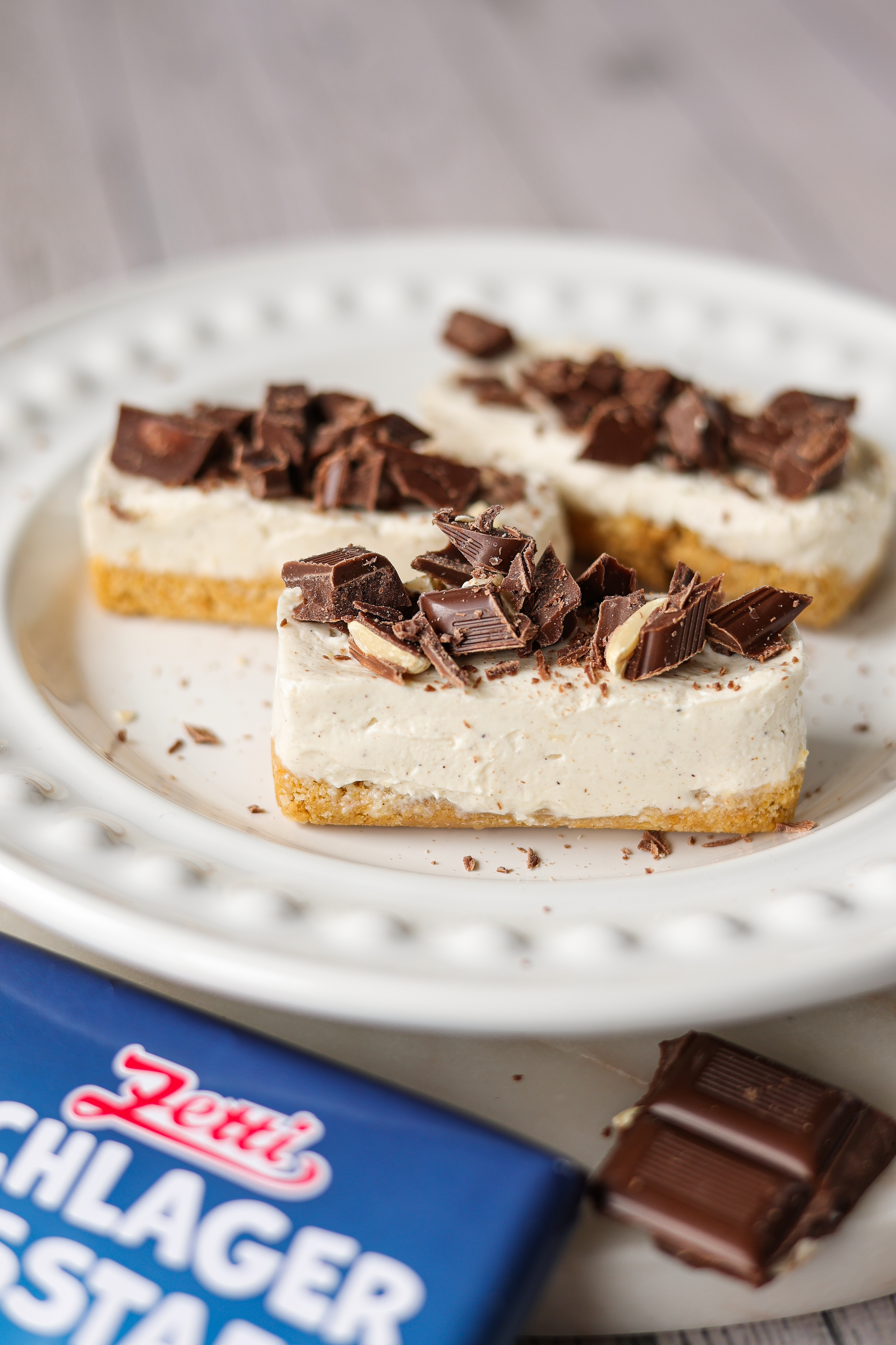 4. Die Cheesecake Bars aus den Formen nehmen. Anschließend die halbe Zetti Schlagersüßtafel mit einem Messer grob zerkleinern und auf den Cheesecake Bars verteilen.