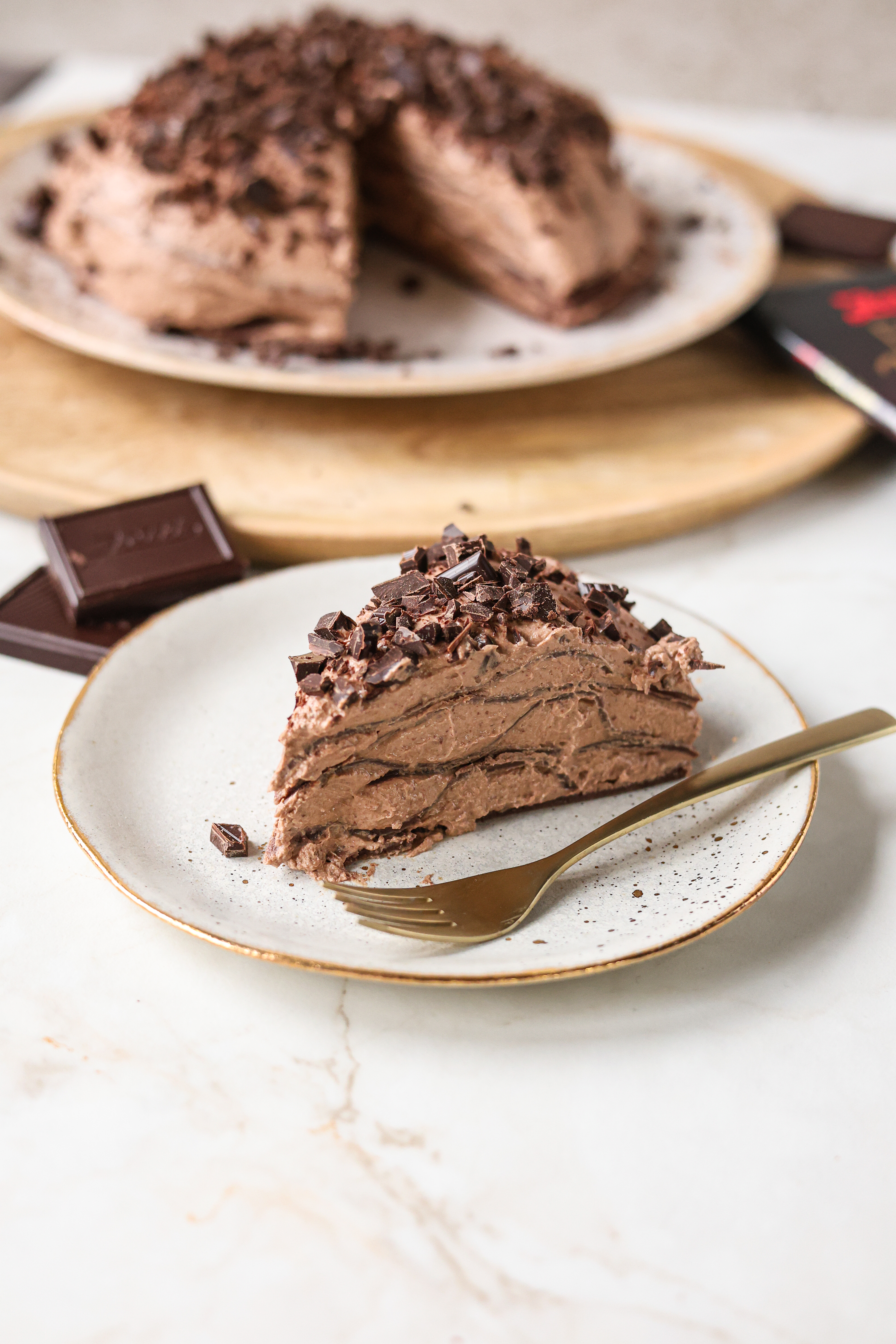 Die restliche Creme auf dem obersten Crêpe verteilen und die Torte mit zerkleinerter Schokolade verzieren.