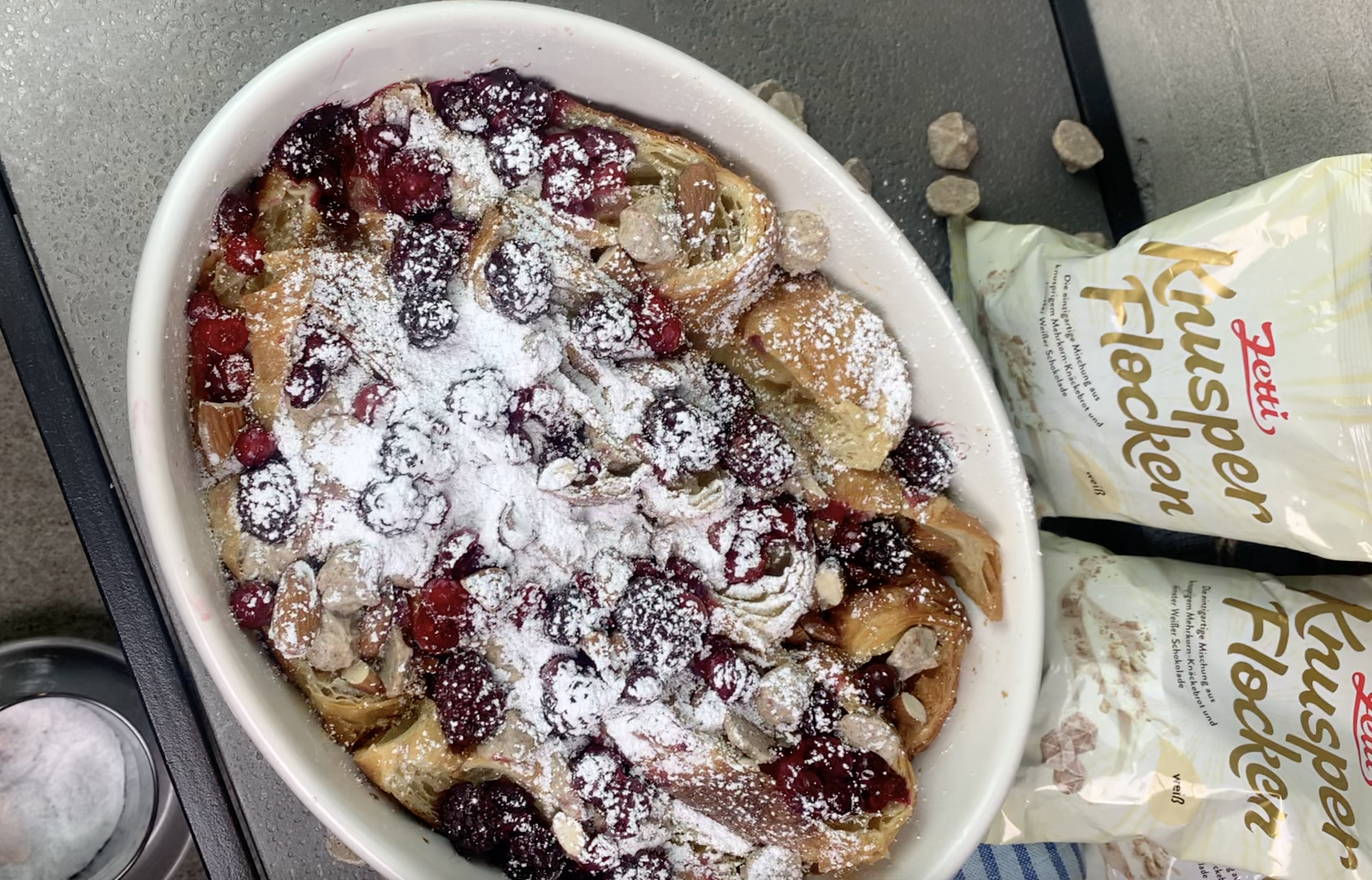 Beeren, veredelt mit weißen Knusperflocken, in unserem verlockenden Croissant-Auflauf. Ein