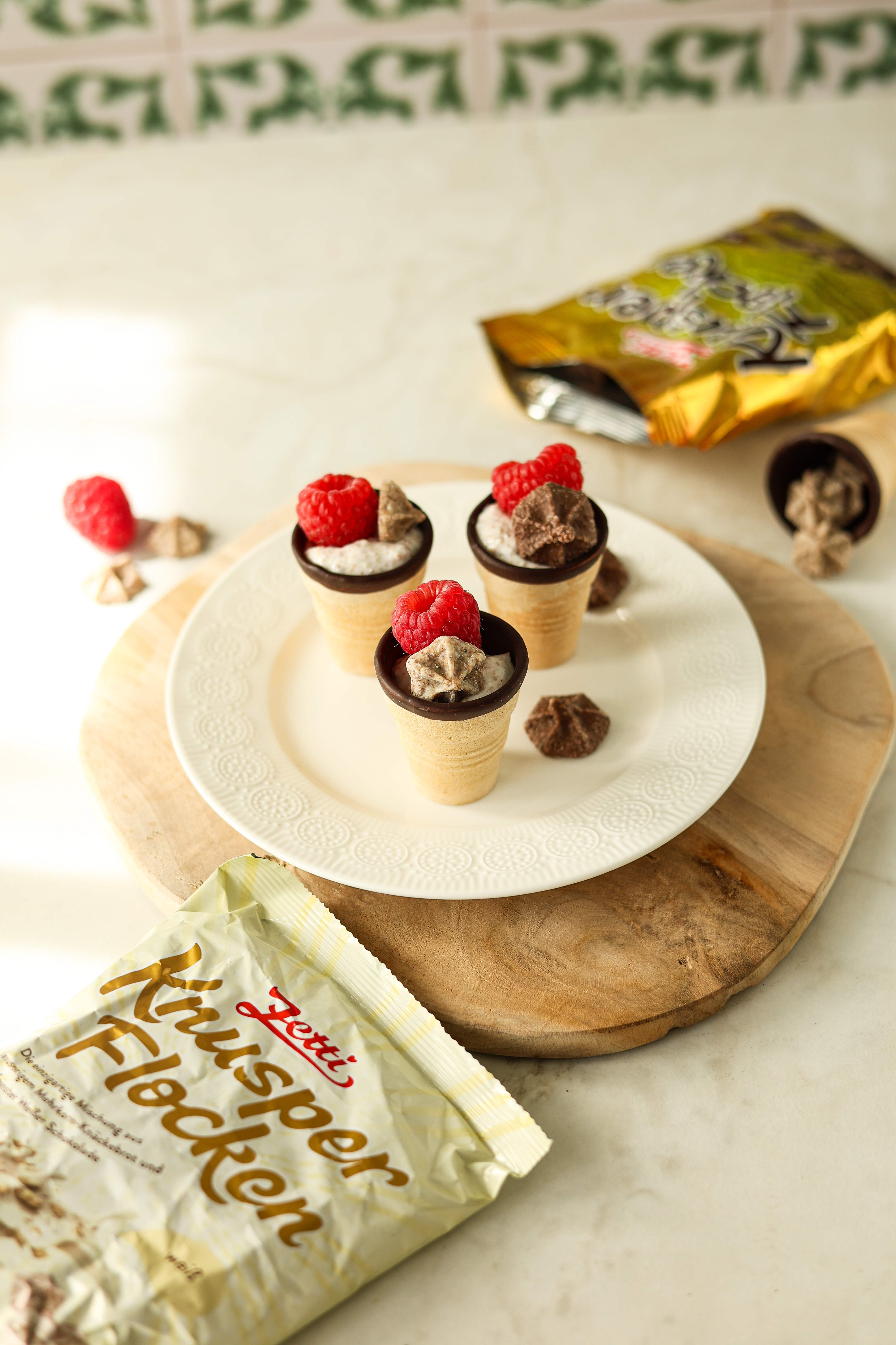 Die Masse in die Waffelbecher füllen, mit Himbeeren und Knusperflocken