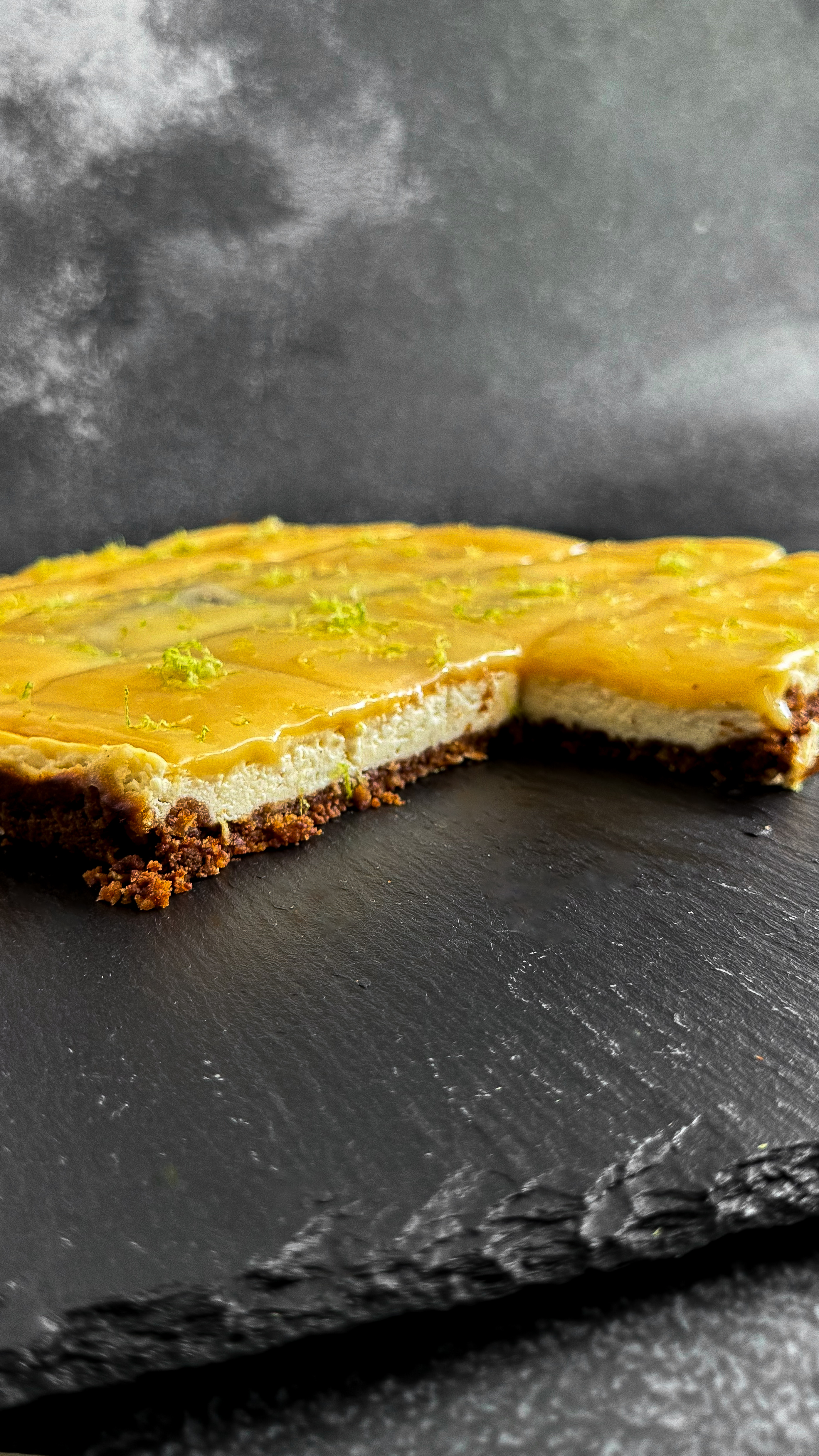 Auf den abgekühlten Kuchen geben & in Stücke schneiden. Ich persönlich mag ihn am liebsten kalt aus dem Kühlschrank.