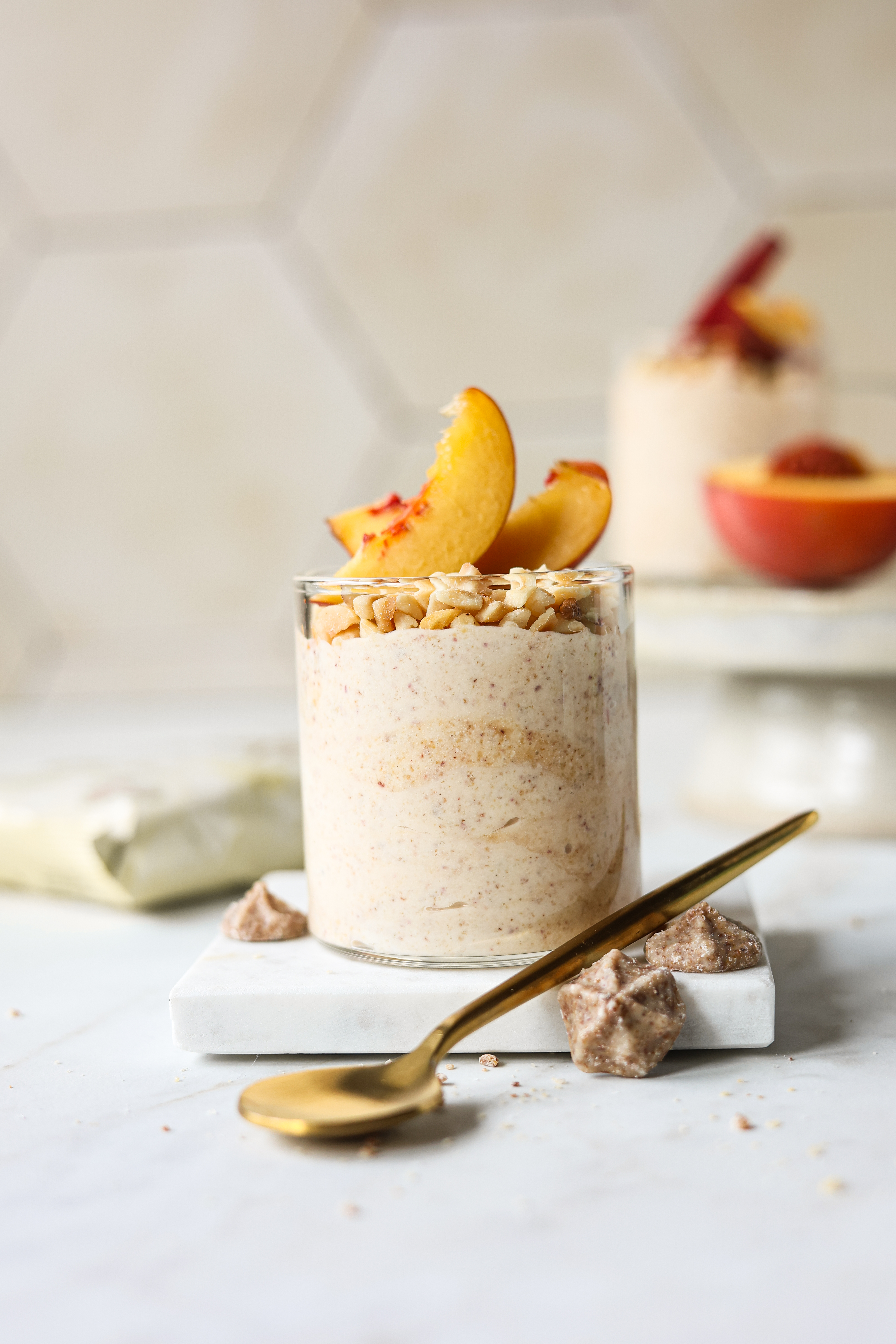 Erfrischung pur: Genieße den Sommer mit der himmlischen Pfirsich Creme mit weißen Knusperflocken!