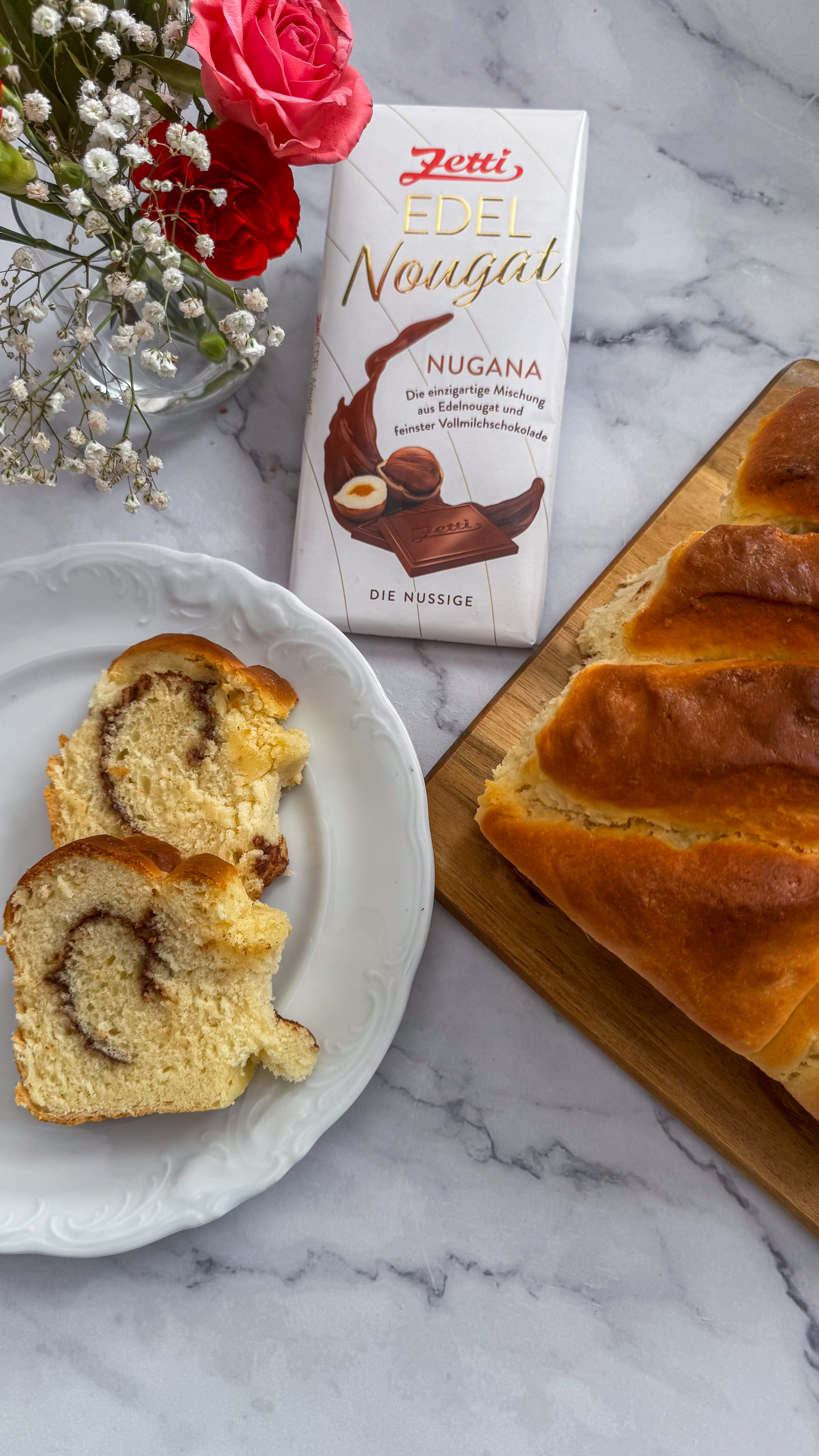 Die Nugana im Wasserbad schmelzen und auf den unteren 2/3 des Teigs verstreichen, den Teig zu einer langen Rolle aufwickeln und danach entweder zu einer Schnecke aufrollen oder wie im Video gezeigt, in 3 gleich große Teile schneiden und in eine gebutterte Auflaufform legen.