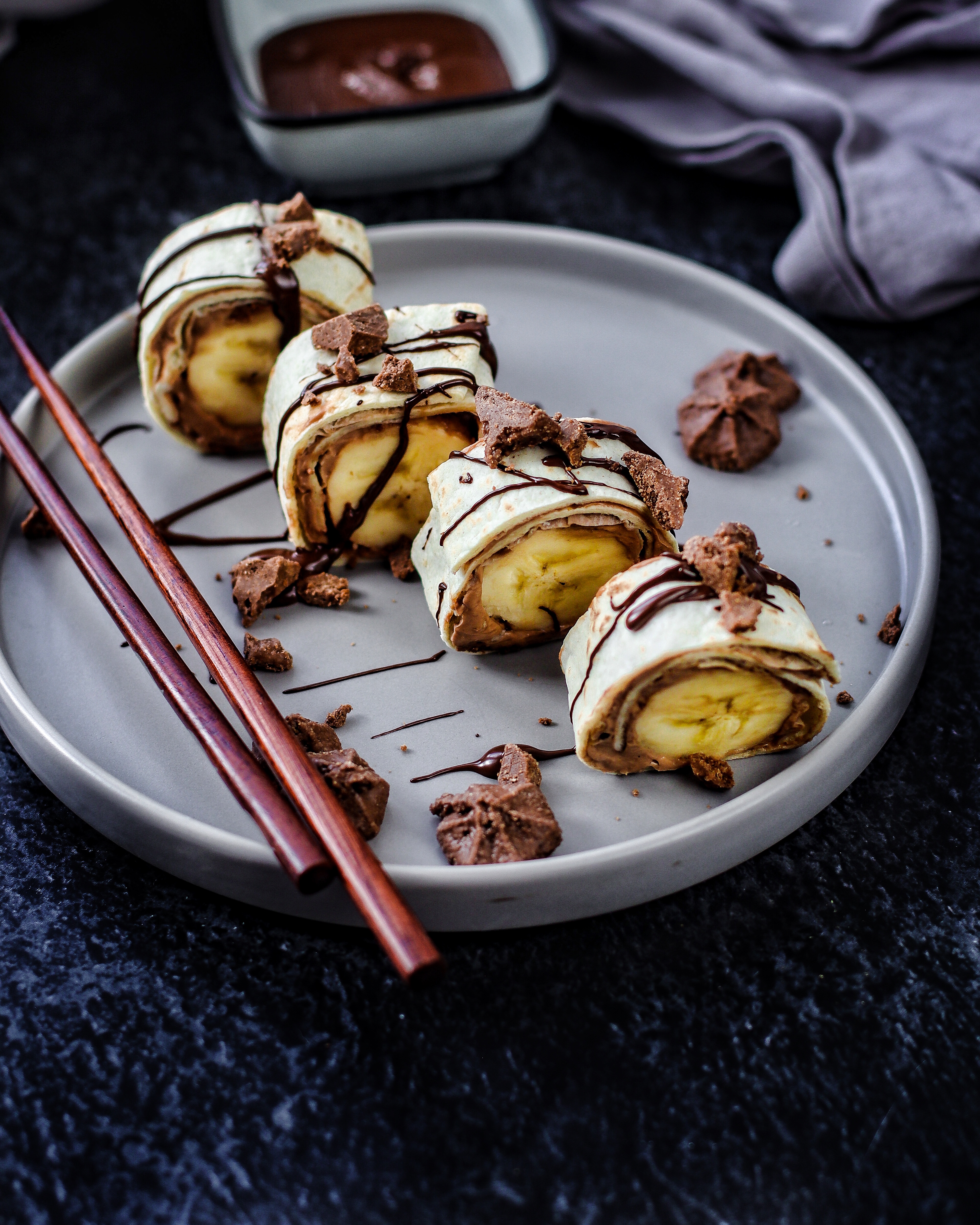 3. Die Creme auf den Tortillas verteilen und eine geschälte Banane darauflegen.